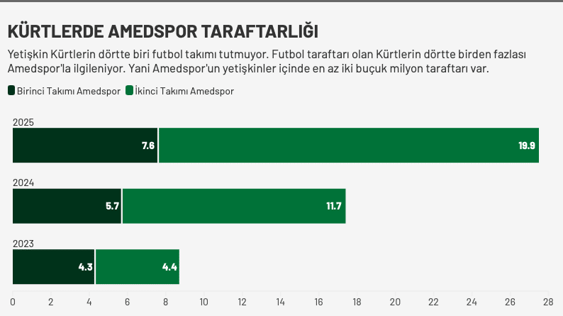 - Amedspor’a ilk ya da ikinci takım olarak ilgi gösteren 18 yaş üzeri kürtlerin sayısı en az 2.5 milyon.